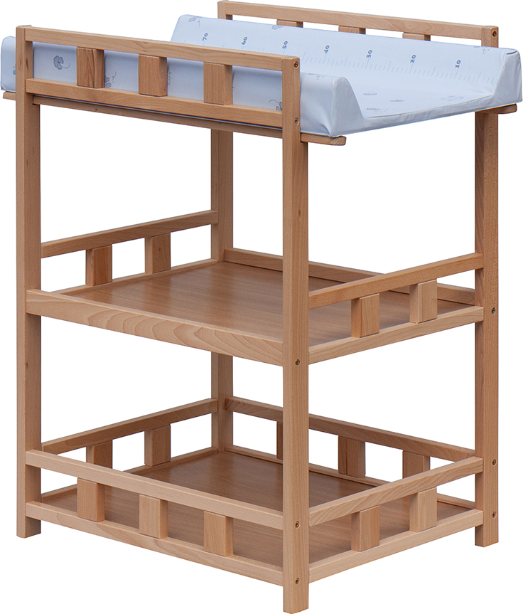 Praktický přebalovací pult se dvěmi policemi z HDF desky. Vrchní přebalovací pult z polyuretanu potažený omyvatelným PVC, vyztužený MDF deskou.